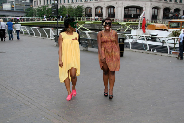 Khloe aka Jadoy turned 21 in May. She decided to have 'our' party in style lol... Getting our black friends and family to dress up and wear a mask was quite a task, but they came hard and represented! Dinner in the heart of Canary Wharf, in a spanish restaurant overlooking the river was bound to be fun and definitely classy, hence Khloe's dress had to be that too. When I went fabric shopping, I came across this very nice, rich looking multicolored French Brocade and I couldn't resist. It wasn't what she wanted so I quickly gave her a ring and described it to her. She agreed to it and the outcome, i must say is gawjus and soo worthy for a 21st bday dress, unique too i think. She paired it up with a slick black and gold mask; a fresh haircut too!